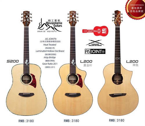 美索吉他的经典型号L200和S200,凭借其卓越的音质与精致的外观,赢得了广泛好评及业界的普遍认可。