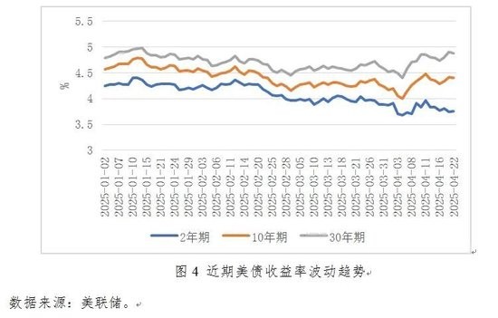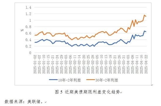 从2025年4月份至今,长期美债收益率呈现出先下降后上升再下降的趋势。4月2日美国政府公布关税政策后,美债收益率经历了一波快速下行,10年期和30年期的美国国债收益率从4月2日到4月4日跌幅分别达4.52%和 2.86%。4月7日-4月11日,美债收益率出现了更为快速的飙升,10年期和30年期美国国债收益率分别在4月11日达到了4.48%和4.85%,涨幅为11.72%和9.98%。此后,美债收益率在波动中小幅回落,4月22日的10年期和30年期美国国债收益率分别为4.41%和4.48%。而短期美债收益率却相反,呈现出波动下降的趋势,4月2日-4月22日下跌幅度为3.84%(详见图4),使得同期10年期-2年期美债收益率增加1倍多,30年期-2年期美债收益率提高77.78%(详见图5)。