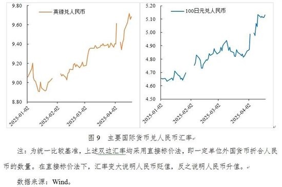 一季度,人民币相对美元升值,相对欧元、日元和英镑贬值。4月2日,在特朗普实施“对等关税”政策后,人民币相对美元、欧元、日元和英镑均出现较大幅度贬值,此后随着中国对美提出反制措施以及特朗普宣布对部分国家实施延缓90天关税措施,人民币相对美元快速升值,截至4月18日美元兑离岸人民币汇率在7.3附近。相比之下,同期人民币相对欧元、日元和英镑尚未表现出明显的升值趋势(见图9)。本报告在第二部分分析指出,在特朗普的“对等关税”政策下投资者抛售部分美元资产转向欧元、日元和英镑资产,从而导致欧元、日元和英镑相对美元的升值幅度超过人民币相对美元升值幅度,因此人民币相对欧元、日元和英镑仍呈现小幅贬值态势。