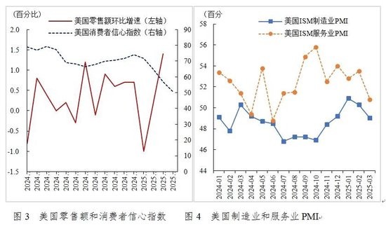 从消费端来看,3月美国零售销售额环比增长1.4%,较2月0.2%的增幅大幅上涨,这是2023年1月以来美国最大的单月零售额环比涨幅(见图3实线)。但这一快速增长的零售额数据并非美国经济强劲的信号,而是美国消费者在大规模关税生效前掀起大件商品(主要是汽车)抢购潮,推动美国零售额显著增长。如果剔除汽车及其零部件销售额,3月美国零售额环比增幅仅为0.5%。从密歇根大学发布的数据来看,今年以来美国消费者信心指数连续下降,4月美国消费者信心指数为50.8,这是2022年6月以来的最低值(见图3虚线)。