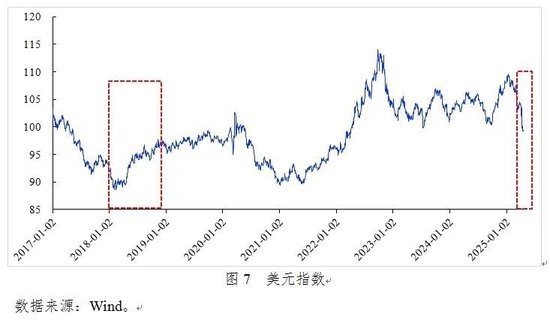 此前的经验证据大都支持关税使本币升值的理论预测,如2018年美国对华加征关税推动美元指数上涨超8%,而人民币则承受较大的贬值压力。但在“对等关税”冲击下,美元指数却并未延续历史轨迹和市场预期同步走强。据彭博提供的高频数据,在 “对等关税”宣布后,美元指数非但没有上涨反而出现了大幅下跌的市场行情。为何美元在本次关税冲击下表现出与传统经济理论预测完全相反的反应呢(见图7)?