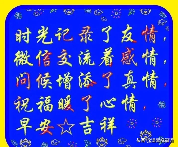 11、短信传递祝福话,喜气洋洋笑哈哈;工作顺心身体好,生活甜蜜美如花;大事小情乐助人,朋友亲人齐赞夸;祝福给你每天顺,吉祥平安幸福家。早安!愿你心情无比灿烂,生活舒心无忧烦!