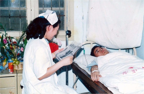 这张照片拍摄于2000年6月,躺在病床上的是我们部队的一等功臣林其葵,我正在为他读报。当时我是中国人民解放军某部医院住院部护士,负责日常护理和心理疏导。