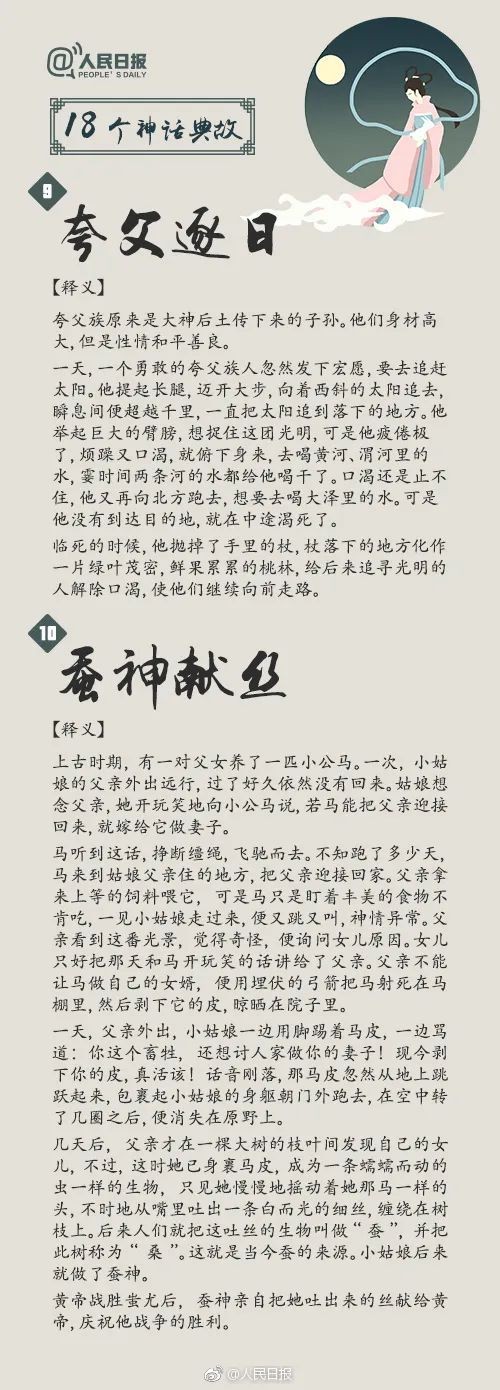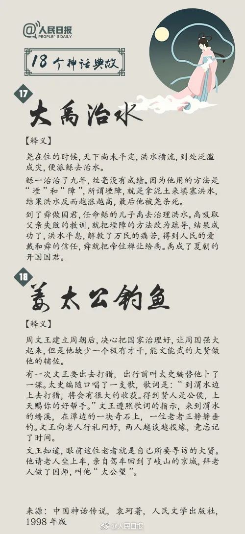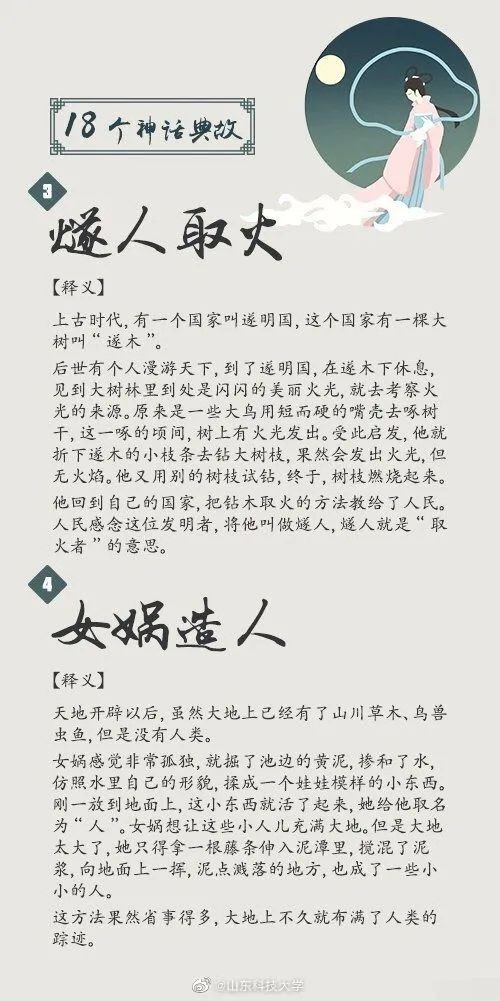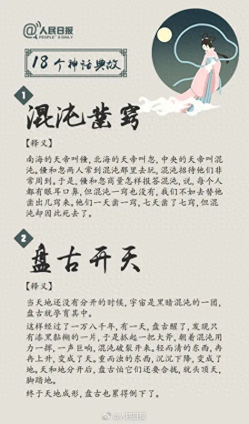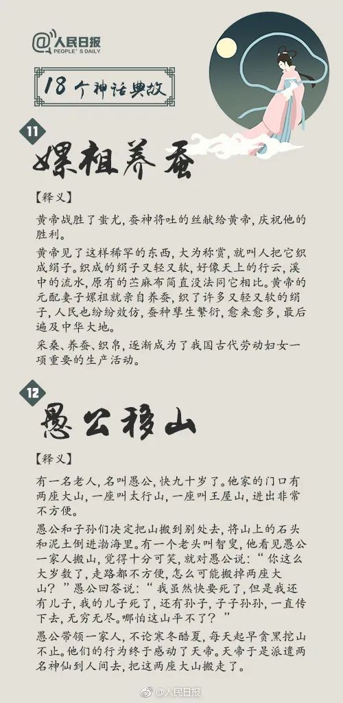 中华文化博大精深,神话故事更是其中的璀璨瑰宝,不仅体现了古代劳动人民天马行空的浪漫想象,更展示出他们勤劳勇敢的美好品质。“盘古开天”“女娲造人”“愚公移山”“精卫填海”……18个脍炙人口的神话典故,戳图↓↓转给孩子,一起领略神话的魅力吧!
