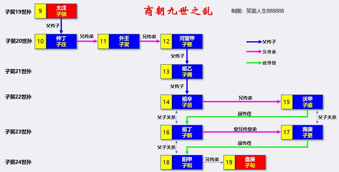 《史记·殷本纪》点评九世之乱:自中丁以来,废適而更立诸弟子,弟子或争相代立,比九世乱,於是诸侯莫朝。(译文:中丁死后,废黜嫡子即位而拥立兄弟和兄弟的儿子,兄弟们的儿子为取得王位而互相争斗,连续九任君主继位都很混乱,诸侯们都不再来朝见)