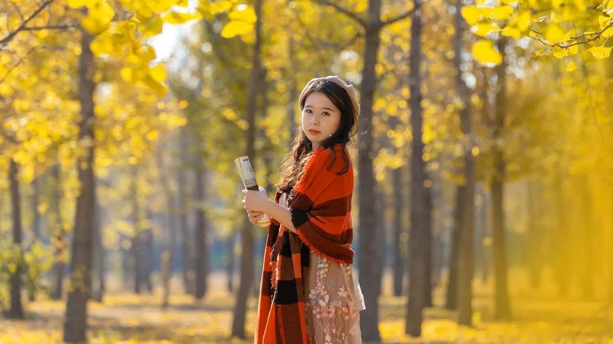 阵阵秋风掠过,吹落片片树叶,金黄色的树叶随风在空中飞舞,象是千万只张开金色翅膀的蝴蝶,在翩翩起舞。那女生兴奋地仰着头张开双臂旋转着身子,她在转着圈儿,象似在雪中飞舞,两只手又象似在迎接那飘落的雪花。挂在脖子上的大红毛线围巾随风飘荡着,犹如彩蝶翩翩,围着她飞舞的是那一只只金色的小蝴蝶,煞是好看,满是江南女子烂漫静雅之气。