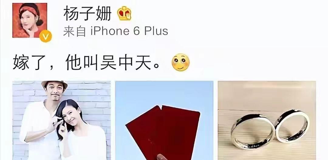 2015年10月份,杨子珊在微博上晒出了一张结婚证,宣布了自己与吴中天的婚讯。这场婚礼犹如一场盛大的狂欢派对,吸引了无数人的目光。婚后,吴中天对妻子更是宠爱有加,她的每一个愿望他都会尽力满足。