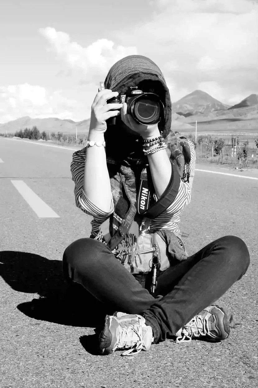 “短发,灰色帽子拉低遮住脸,身材瘦削,不仔细看,会把她错认为男孩子。她总是行走在山间,手拿卓玛刀防身,吸收最粗旷最具灵性的天地之气,活得跟秃鹫一般孤独桀骜。”