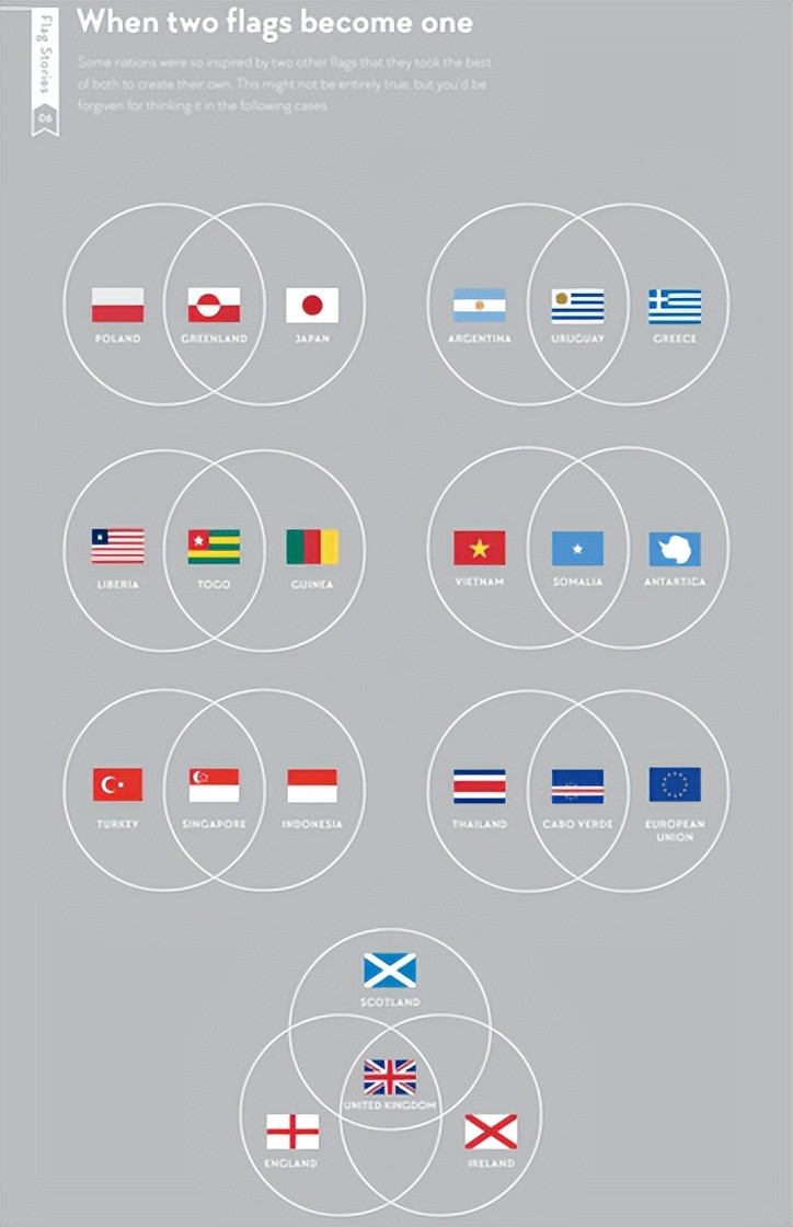 例如,英国国旗是一种将苏格兰、英格兰、爱尔兰三面国旗结合在一起的设计。