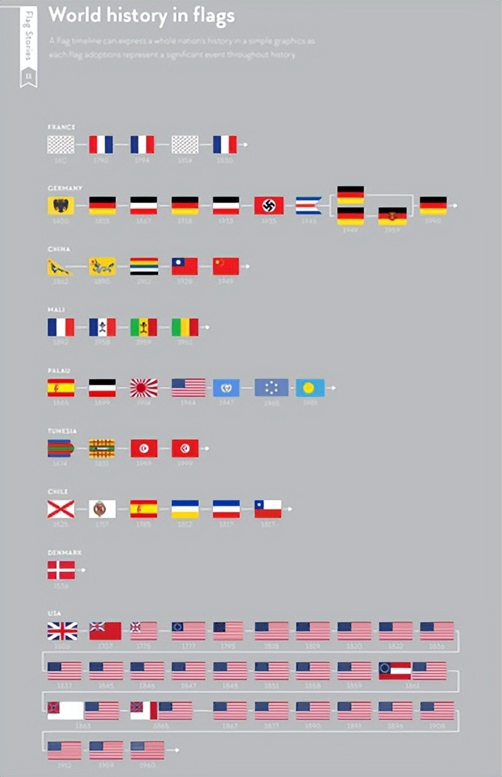 当你看国旗设计的过渡时,你可以看到国旗是随着国家的历史而变化的。然而,像丹麦一样,一些国家自1536年以来继续使用相同的国旗。