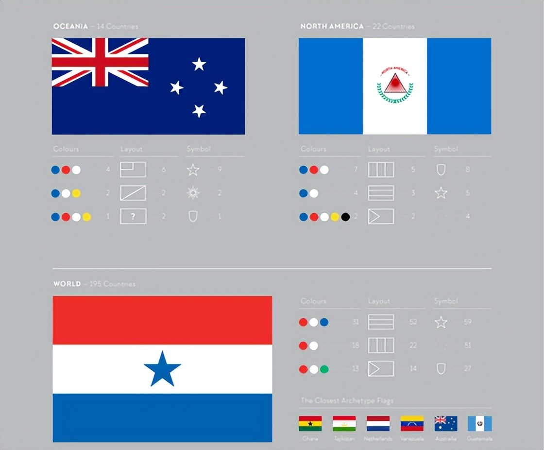 国旗分为彼此相似的颜色和符号,如下所示。创建新标志时,如果使用当前未使用的颜色和标记的组合进行设计,则可能会起作用。