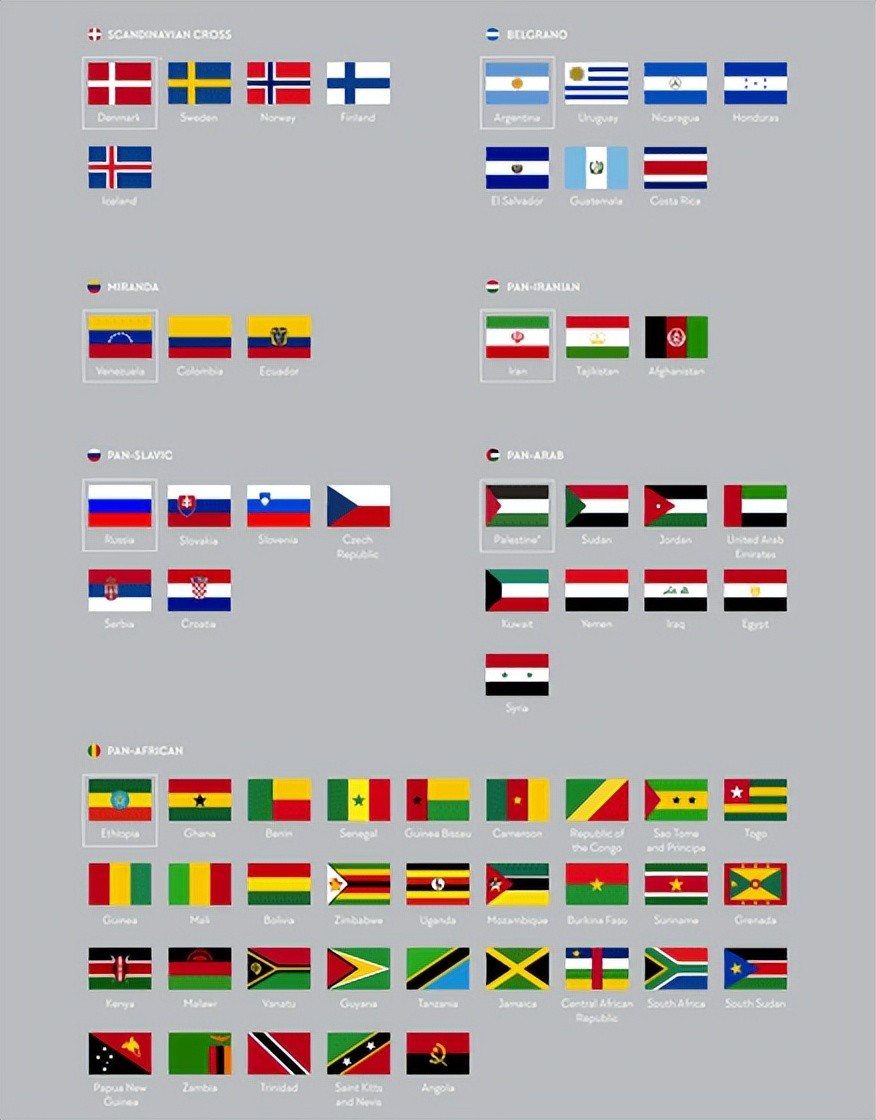 全世界大约三分之一的国旗可以分为七组“斯拉夫人”“伊朗部落”“阿拉伯部落”“斯堪的纳维亚(十字架)”“非洲部落”“贝尔格拉诺”“米兰达”我能做到。