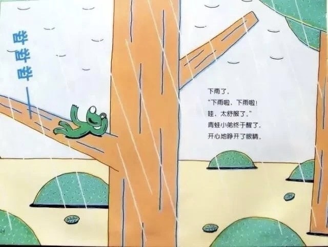 哗哗哗——下雨了。“下雨啦,下雨啦!哇,太舒服了。”青蛙小弟终于醒了,开心的睁开了眼睛。