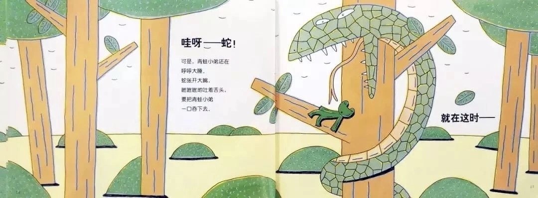 哇呀——蛇!可是,青蛙小弟还在呼呼大睡。蛇张开大嘴,咝咝咝地吐着舌头,要把青蛙小弟一口吞下去。就在这时——